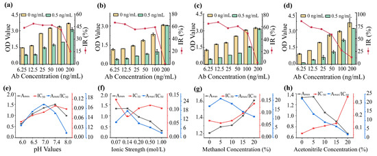 Optimization of icELISA. The concentrations of coating antigen were (a) 0.4 µg/mL, (b) 0.2 µg/mL, (c) 0.1 µg/mL, and (d) 0.05 µg/mL with Ab concentrations ranging from 6.25 to 200 ng/mL. The optimization of (e) pH values, (f) ionic strength, (g) methanol concentration, and (h) acetonitrile concentration (n = 3). Ag indicates coating antigen, Ab indicates mAb, and IR is the abbreviation of inhibition ratio. The yellow and green bar chart in (a–d) shows the OD value in the presence of DNC at 0 and 0.5 ng/mL, respectively. The error for all graphs was within the standard deviation.