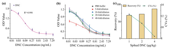 Under the above optimal conditions, a standard curve in the buffer solution was generated with the increase of DNC concentrations (Figure 2a). A four-parameter equation was adopted for the fitting and analysis of the standard curves; the IC50 was as low as 0.06 ng/mL and the IC10 (limit of detection) was 0.02 ng/mL in the buffer solution.