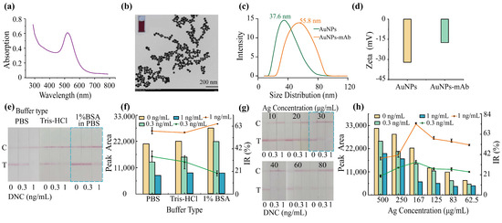 The (a) UV−vis spectra of AuNPs; (b) the transmission electron micrograph of AuNPs; (c) the size distribution of AuNPs and AuNPs–mAb; (d) the zeta potential of AuNPs; photographs of test strips optimizing the (e) buffer type of mAb and (g) Ag concentration, peak area, and IR optimizing the (f) buffer type of mAb and (h) Ag concentration. Ag indicates the coating antigen, and IR is the abbreviation for the inhibition ratio. The dashed box on the test strips presents the optimal condition. The bar chart in (f,h) indicates the peak area, and the green and red lines indicate IR in the presence of DNC at 0.3 and 1 ng/mL, respectively. The error for all graphs was within the standard deviation.