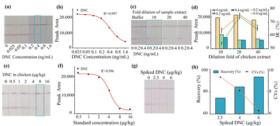 (a) Photographs of test strips and (b) standard curve with the increasing DNC concentrations in buffer solution. (c) Photographs of test strips, (d) peak area, and IR when exploring the matrix effect. (e) Photographs of test strips and (f) standard curve with the increasing DNC concentrations in chicken. (g) Photographs of test strips and the (h) recovery test in the spiked chicken. The bar chart in (d) shows the peak area and the green and red lines indicate IR in the presence of DNC at 0.2 and 0.4 ng/mL, respectively. The error for all graphs was within the standard deviation.