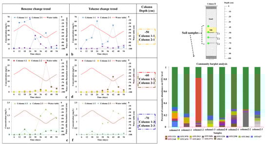 - For a contaminated site with a single-lithology structure consisting of sand, GTF promotes downward BTEX migration, and the contaminant concentration in the saturated zone increases, which is why more attention should be paid to organic contaminant removal within the groundwater. A contaminated site with a double-lithology structure containing silt has more retention contamination with BTEX and is more suited to the removal of organic contaminants from the silt layer. The bacterial community structures in the two columns are very different, especially in the GTF zone, and further research can provide important data for BTEX biodegradation. Biodegradation kinetics should be considered in long-term prediction models of groundwater table fluctuations and should be better understood for the remediation of BTEX compounds.