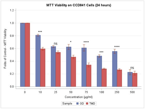 Cell viability: MTT assay. Higher concentrations of OD and TMD are associated with reduced cellular metabolic activity in CCD841 cells after 24 h of exposure. We use ns, *, **, ***, and **** to denote p > 0.05, p ≤ 0.05, p ≤ 0.01, p ≤ 0.001, and p ≤ 0.0001, respectively, when comparing TDM to OD via Tukey’s post hoc analysis of the two-way ANOVA.