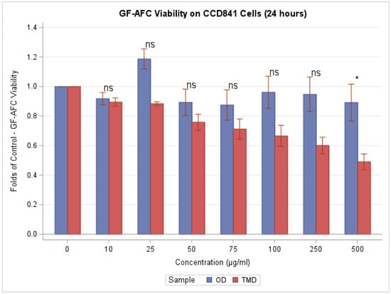 Figure 2 summarizes the results of protease analysis (GF-AFC). Our findings reveal that TMD significantly reduced colon cell viability in a concentration-dependent manner (F(7,24) = 11.56, p < 0.0001 for TMD; F(7,24) = 1.23, p = 0.3230 for OD). Differences in cell viability, with respect to control, between TMD and OD were marginally significant (F(7,48) = 2.11, p = 0.0605). Folds of control were significantly lower for TMD than OD, and hence had a stronger effect only at the 250 and 500 μg/mL concentrations (p = 0.0966, and 0.0245, respectively, according to Tukey’s post hoc analysis of the two-way ANOVA). At the highest concentrations of exposure (500 µg/mL), cell viability was decreased by 51.0 percent for TMD and 10.8 percent for OD relative to the control exposure.