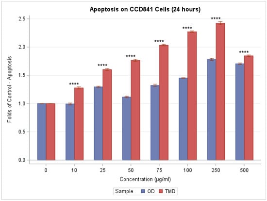 The stimulation of caspase 3 and 7 was examined after 24 h of indoor dust exposure to investigate the process of CCD841 apoptosis. For TMD exposure, there was a monotonic, significant linear increase in apoptosis activity as concentrations increased until reaching the 250 µg/mL concentration (F(7,24) = 763.96, p < 0.0001). In comparison, OD dust exposure initially led to little change in apoptosis, but caspase activation was improved after reaching a concentration of approximately 25 µg/mL. Beginning at 25 µg/mL and beyond, apoptosis for OD was consistently significantly higher than at baseline, as shown in Figure 3 (F(7,24) = 455.54, p < 0.0001). The increase in apoptosis, measured in folds of control, for TMD was much more substantial than that of OD (F(7,48) = 179.63, p < 0.0001). Specifically, apoptosis, measured in folds of control, was significantly higher for TMD than for OD, and hence had a stronger effect at all concentrations (p < 0.0001 from Tukey’s post hoc analysis of the two-way ANOVA).
