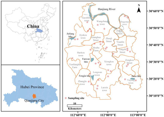 China is the world’s leading crayfish producer. For example, FAO showed that crayfish production in 2017 (in China) exceeded 1 million tons, with a value of 37 billion USD, representing 80% of global production [38]. Hubei Province (central China) produces the highest amount of crayfish in China, accounting for 32.3% of the total crayfish production in 2021 [47] with an output value of 132.54 billion yuan in 2021 (http://www.hubei.gov.cn/hbfb/bmdt/202202/t20220221_4006309.shtml, accessed on 21 February 2022). Red swamp crayfish farming mainly occurs in Qianjiang city in Hubei. Moreover, many Chinese people buy crayfish from Qianjiang, indicating that the area is suitable for the analysis of heavy metals in crayfish and their associated health threats to humans. Although there are more wide-ranging studies on risk assessment, no study has reported on a single region teeming with crayfish [14,48].