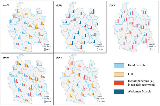 The concentrations of the five heavy metals were consistent with the results of previous studies (Table 1) performed in Anfusi County, another city in Hubei [58]. The distribution of the same metal across different tissues is presented in Figure 2. Each histogram in Figure 2 is based on the average metal concentration of two adjacent sites. Metal concentrations were significantly different among different regions of Qianjiang. Pb and As concentrations were higher in the head than in the other tissues. Nonetheless, the As concentration was higher in the hepatopancreas than in the other tissues in some sample sites (Figure 2A,D). Hg and Cd levels were highest in the abdominal muscles and hepatopancreas, respectively, (Figure 2B,C). Cu levels were highest in the gills in most areas. However, Cu levels were higher in the hepatopancreas than in the gills in other areas (Figure 2E). Notably, the concentration of the metals (except Hg) was higher in the hepatopancreas than in other tissues, consistent with results of Rodriguez-Estival et al. (2019) [26]. Most studies have shown that the hepatopancreas of red swamp crayfish is the primary organ for storing trace metals [25,60]. The higher Hg levels in the abdomen muscle could be due to the high affinity for sulphur-containing cysteine in Hg proteins [61]. Compared with other tissues, muscles accumulate large Hg amounts [62].