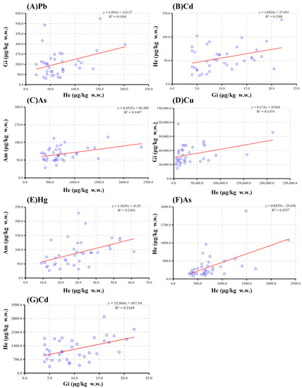 Linear regression analysis of the same metals in different tissues. The linear correlation was presented for Pb (A) and Cd (B), As (C), and Cu (D) between different tissues (p < 0.05), while Hg (E), As (F), and Cd (G) showed a strong correlation between the hepatopancreas and other tissues (p < 0.01). Hc, Head capsule; Gi, Gill; He, Hepatopancreas; Am, Abdominal muscle.