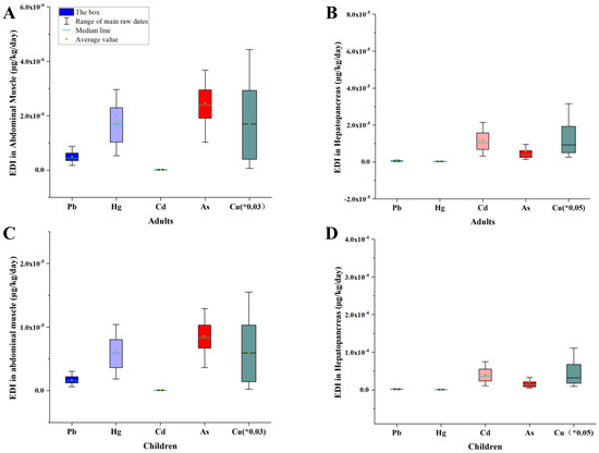 The EDI (μg/kg/day) of Pb, Hg, Cd, As, and Cu via the consumption of P. clarkii from Qianjiang. The EDIs of the abdominal muscle and hepatopancreas for adults and children are presented in (A–D), respectively. Due to the high EDI values of Cu, the displayed value is the original value multiplied by 0.03 or 0.05.