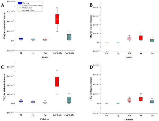 The mean THQ values for each toxic substance in the hepatopancreas and abdomen muscle are shown in Table 1. The THQ values for toxic compounds in the hepatopancreas and abdomen muscle tissues from all sites are shown in Supplementary Table S3 (children) and Table S5 (adults). The distribution range of THQ is shown in Figure 5. Additionally, As had the highest THQ value in the hepatopancreas in both children and adults, whereas Cd had the lowest THQ value in abdominal muscle (Table 1). Furthermore, THQ values for each toxin were less than 1 for both tissues (Table 1 and Supplementary Tables S3 and S5), indicating that the average daily intake of each of the metal was lower than the corresponding reference dosage in both children and adults. Therefore, a lifetime exposure to these concentrations of the metals may not have any harmful effects on humans.