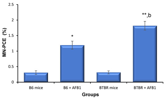 The MN percentage was statistically higher in the positive control than the vehicle control B6 mice (1.51 ± 0.26). The BTBR mice did not demonstrate any statistically differences in the incidence of MN when compared to the vehicle control B6 (Figure 1), while for the mice treated with AFB1, there was a statistically significant stimulatory effect on MN generation with both the BTBR and vehicle control B6 when compared to the unexposed control B6. Furthermore, the frequency of MN in the BTBR animals exposed to AFB1 was statistically higher than that in the AFB1-exposed B6 animals (p < 0.01). In the present investigation, no bone marrow suppression was observed and the PCE ratios were similar in all mice.