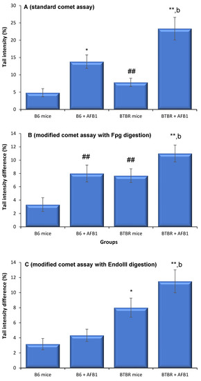 Levels of DNA strand breaks (tail intensity) in the bone marrow of mice 24 h after their last exposure to aflatoxin B1 (AFB1, 1.25 mg/kg for 28 days; mean ± SD). (A) = cells incubated with buffer only, (B) = cells incubated with Fpg, and (C) = cells incubated with Endo III. * p < 0.05, ** p < 0.01 vs. B6 control mice (Kruskal–Wallis test). ## p < 0.01 vs. B6 mice and b p < 0.01 vs. B6 + AFB1 (Mann–Whitney U-test).