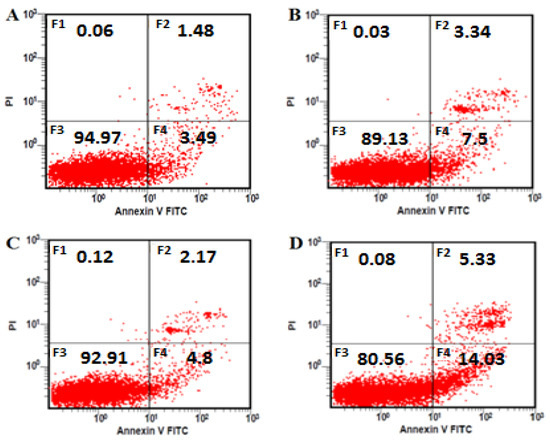 A representative flow cytometry image of Annexin V-propidium iodide (PI) double-stained bone marrow cells of mice 24 h after their last exposure to aflatoxin B1 (AFB1, 1.25 mg/kg for 28 days; mean ± SD). (A) = B6 control mice, (B) = B6 mice treated with AFB1, (C) = BTBR mice, and (D) = BTBR mice treated with AFB1.