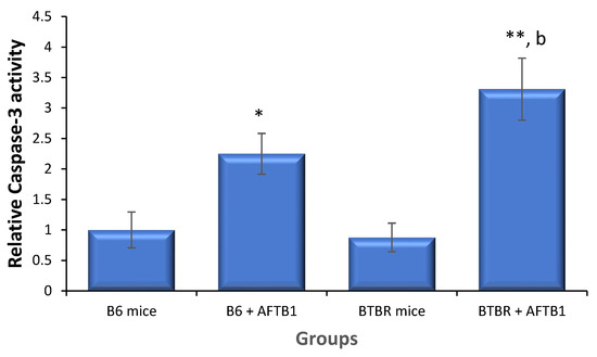 Relative caspase-3 activity in the bone marrow cells of mice 24 h after their last exposure to aflatoxin B1 (AFB1, 1.25 mg/kg for 28 days; mean ± SD). * p < 0.05, ** p < 0.01 vs. B6 control mice and b p < 0.01 vs. B6 + AFB1 (ANOVA test).
