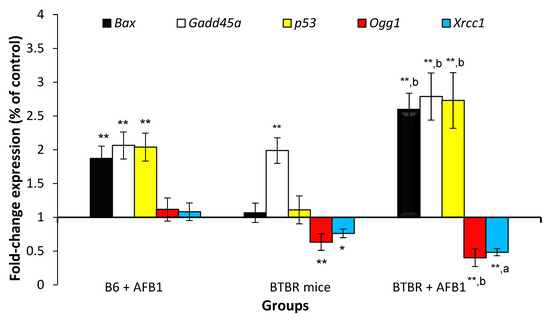 The expression changes in the Bax, Gadd45a, p53, Ogg1, and Xrcc1 mRNA transcripts relative to the vehicle control B6 mice are shown in Figure 5. Significant upregulation in the expression of the Bax, Gadd45a, and p53 mRNA transcripts was observed after AFB1 exposure in B6 mice when compared to the vehicle control B6 animals. No apparent alteration was detected in the expression of the p53 and Bax mRNA transcripts between the BTBR and vehicle control B6 mice. However, an obvious upregulation in the expression of the Gadd45a mRNA transcript and downregulation of the Ogg1 and Xrcc1 mRNA transcripts was observed, indicating DNA repair impairment in the BTBR animals. The expression levels of the Bax, Gadd45a, and p53 mRNA transcripts were statistically augmented in AFB1-treated BTBR animals compared to the unexposed BTBR mice and B6 mice exposed to AFB1. Furthermore, the administration of AFB1 to BTBR animals reduced the downregulation of the Xrcc1 and Ogg1 mRNA transcripts to levels that were significantly different from those in the unexposed BTBR animals and B6 mice exposed to AFB1.