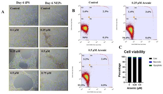 Next, iPS cells were differentiated into neuroepithelial progenitors (NEPs) for six days while being exposed to 0, 0.25, 0.5, or 0.75 µM arsenic. There were no morphological differences between exposure groups (Figure 1A). Consistently, flow cytometry with Annexin V and Sytox green (Figure 1B) did not indicate significant differences in the percentage of live, apoptotic, and necrotic cells following exposure to 0.25 or 0.5 μM arsenic for six days (Figure 1C). Considering the absence of morphological alterations during NEP differentiation and no significant changes in cell viability or death, concentrations of up to 0.5 μM arsenic were used for the remainder of the study.