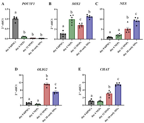 Differential gene expression of key markers during differentiation of human iPS cells into motor neurons. Transcript levels of POU5F1 (A), SOX1 (B), NES (C), OLIG2 (D), and CHAT (E) were assessed by qPCR in control samples from day 0 human iPS cells (gray, circles), day 6 NEPs (green, diamonds), day 12 MNPs (red, triangles) and day 18 early MNs (blue, circles). Fold change was determined using the ΔΔCt method, and results were normalized to geometric mean of Gapdh and β2-microglobulin. Statistical differences were determined using ANOVA followed by Tukey’s multiple comparison test (p ≤ 0.05; n = 4–6 per exposure group; a = no statistical difference from day 0; b = statistically different from day 0; c = statistically different from all other days).
