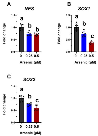 Arsenic exposure reduces neuronal differentiation markers in D6 neuroepithelial progenitor (NEP) cells. Transcript levels of NES (A), SOX1 (B), and SOX2 (C) were assessed in D6 NEPs exposed to 0 (black, circles), 0.25 (blue, squares), or 0.5 μM (red, triangles) arsenic by qPCR. Fold change was determined using the ΔΔCt method and results were normalized to the geometric mean of Gapdh and β2-microglobulin. Statistical differences were determined using ANOVA followed by Tukey’s multiple comparison test (p ≤ 0.05; n = 5–6 per exposure group; a = no statistical difference from control; b = statistically different from control; c = statistically different from all other exposure groups).