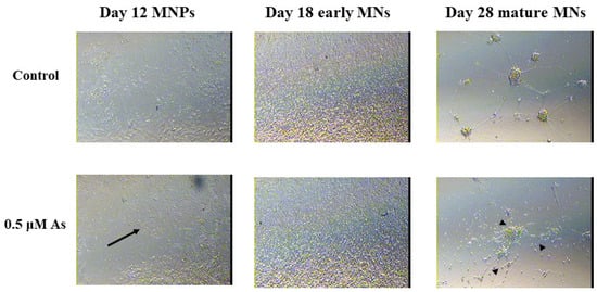 Arsenic exposure leads to morphological alterations of MNPs and MNs. Representative images at 10X of D12 MNPs, D18 early MNs, and at 20X of D28 mature MNs exposed to 0 or 0.5 μM arsenic. The arsenic-exposed D12 MNPs have less concentric organization and fewer elongated MNPs (arrows) while the arsenic-exposed D28 mature MNs have reduced neurite length (arrows heads).