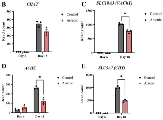Mammalian motor neurons can release both acetylcholine and glutamate []. Typically upper motor neurons form glutamatergic synapses while lower motor neurons are cholinergic neurons []. Interestingly, both pathways associated with glutamatergic synapses (Figure S2C) and cholinergic synapses (Figure 8A) were downregulated in arsenic-treated D18 early MNs. In cholinergic neurons, ChAT is the enzyme involved in the biosynthesis of the neurotransmitter acetylcholine, which is loaded into presynaptic vesicles by the vesicular acetylcholine transporter (VAChT) and released into the synaptic cleft. Afterward, acetylcholine is hydrolyzed by acetylcholinesterase (AChE) into acetate and choline, and choline is transported back into the presynaptic nerve terminal by the choline transporter (ChT). Transcript expression of the cholinergic pathway genes CHAT, SLC18A3 (encoding for VAChT), ACHE, and SLC5A7 (encoding for ChT) were downregulated in arsenic-treated D18 early MNs by 1.4-, 2-, 2.2-, and 1.3-fold, respectively (Figure 8B–E). Read counts of these genes were consistently increased in D18 early MNs as compared to D6 NEPs, confirming the formation of cholinergic neurons during the differentiation process (Figure 8B–E). These data, coupled with the observed morphological changes, suggest that arsenic exposure may disrupt the proper formation and function of acetylcholine in motor neurons.