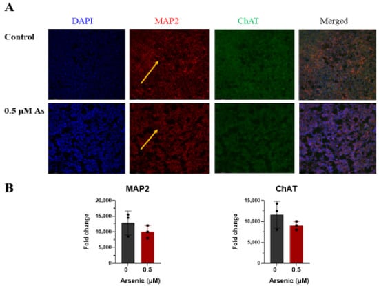 The effects of arsenic exposure on protein expression of the neuronal marker MAP2 [,], and cholinergic marker ChAT were investigated by immunohistochemistry in D18 early motor neurons. While no differences in MAP2 and ChAT protein expression were noted, fewer MAP2+ neuronal extensions can be seen in arsenic-exposed D18 early MNs (arrows; Figure 9A,B). However, in D28 mature MNs, protein expression of MAP2 and ChAT in the cell body of was significantly downregulated in arsenic-exposed samples by 2.8- and 2.1-fold, respectively (Figure 10A,B).