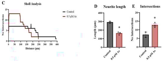 When taking the cultures out to 28 days to form mature motor neurons, ChAT mRNA and protein expression are also reduced following exposure to 0.5 μM arsenic. The neurites from arsenic-exposed motor neurons appear to be less elongated than their control counterparts. Indeed, neurite tracing and Sholl analysis demonstrate the length of MAP2+ neurites was reduced. Several studies conducted in vivo and in vitro have also reported decreased neurite length following arsenic exposure. For instance, neurite length was significantly reduced by 1 μM sodium arsenite in primary cultured neurons [], by 5 μM sodium arsenite and 0.5 μM arsenic trioxide in Neuro-2a cells [,], and by 5 μM sodium arsenite in differentiated neurons derived from mouse embryonic forebrains []. Similarly, treatment with sodium arsenite caused a dose-dependent inhibition of neurite length in differentiated human neuroblastoma SH-SY5Y cells []. Additionally, neurite length reduction has been observed in mice following prenatal exposure to sodium arsenite from gestational day 8 to 18 []. MNs are characterized by long axons that connect them to skeletal muscle [] and, importantly, loss and degeneration of MNs can cause motor neuron diseases including amyotrophic lateral sclerosis and spinal muscular atrophy [,]. Arsenic-induced inhibition of neurite length could also lead to improper function of neuronal circuits as impairment in the patterns and length of neuronal processes has been linked to cognitive alterations and mental retardation [].
