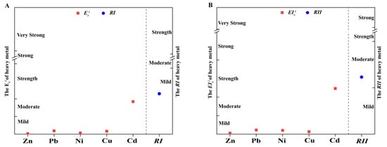 Potential ecological risk assessment of the Henan section of the Yellow River. (A) Potential ecological risk index reported in the literature. (B) Potential ecological risk index calculated using improved toxicity coefficients. RI and RII refer to the potential ecological risk index of composite heavy metals before and after improvement, respectively. and refer to potential ecological risk factors for individual heavy metals before and after improvement, respectively. The red color indicates the potential ecological risk for each metal, and the blue color indicates the potential ecological risk index for composite heavy metals.