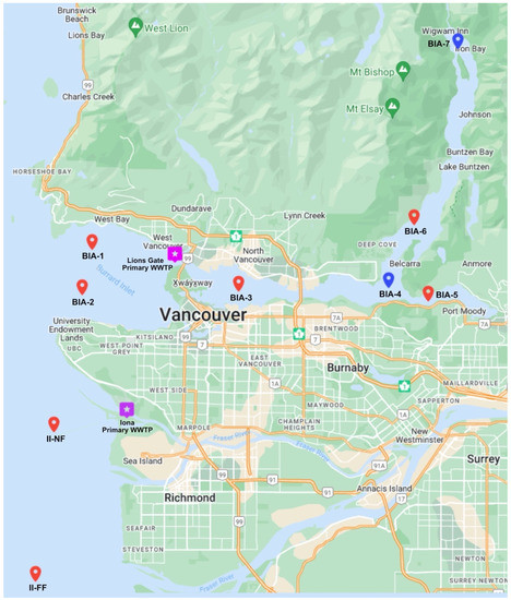 Location of seven sampling sites for the BIAMP involved in water, sediment, and English sole collections [12,13,14]. In 2017, the BIAMP included five sites along the Burrard Inlet (BIA-1, BIA-2, BIA-3, BIA-5, BIA-6), two sites associated with Iona Island (II-NF, II-FF), and two of Metro Vancouver’s primary WWTPs, Lions Gate and Iona (in purple). The map highlights current sampling sites in red and historical sites in blue, with the omission of one site at the mouth of the Indian Arm (BIA-4) and a reference site at the North end of the Indian Arm (BIA-7).