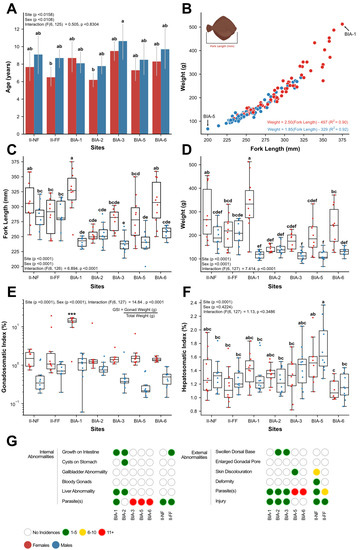 Various fish heath measures in English sole collected during the 2017 BIAMP [12] at seven sites: (A) Mean age one standard error of the mean; (B) Relationship between fork length and wet body weigh; (C) Fork length; (D) Wet body weight; (E) Gonadosomatic index; (F) Hepatosomatic index; and (G) Internal and external abnormalities in males and females pooled within each site. Boxplots show median values, 25th and 75th percentiles, minimum and maximum values, and outliers. A two-way ANOVA followed by a Tukey’s post-hoc test was used to determine significant differences between main effects (site and sex) and their interaction. Different superscripts indicate significant differences (p < 0.05).