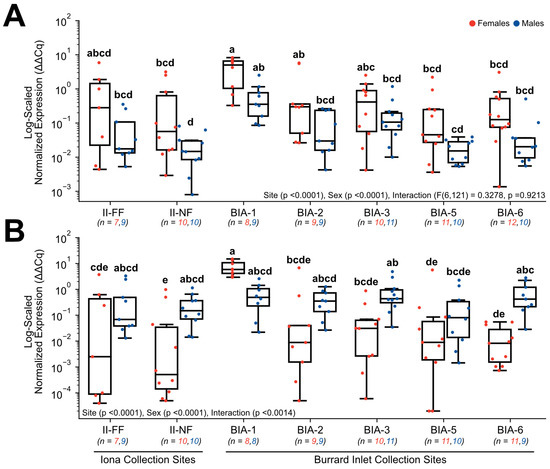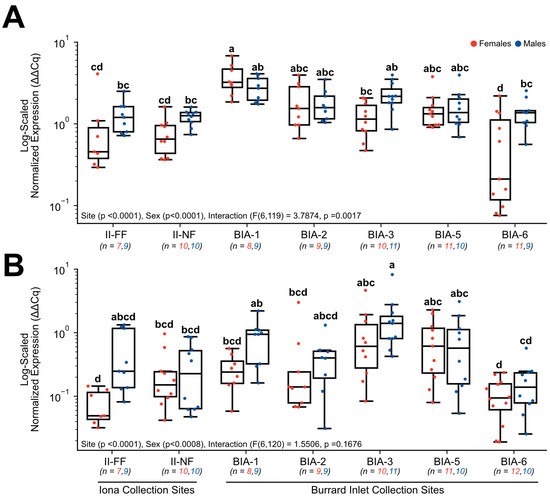 Hepatic gene expression levels of (A) 18S rRNA and (B) RPS4X in English sole at near- and far-field sites from the Iona and Lion’s Gate WWTP in Burrard Inlet. Boxplots show median values, 25th and 75th percentiles, minimum and maximum values, and outliers. Two-Way ANOVA with Tukey’s post-hoc analysis was used to determine significant differences between main effects (site and sex) and their interaction. Biological replicates for each site are provided. Significant site and sex effects were observed in both genes, and a significant interaction effect was observed for 18S rRNA. Different superscript letters indicate significant differences (p < 0.05).