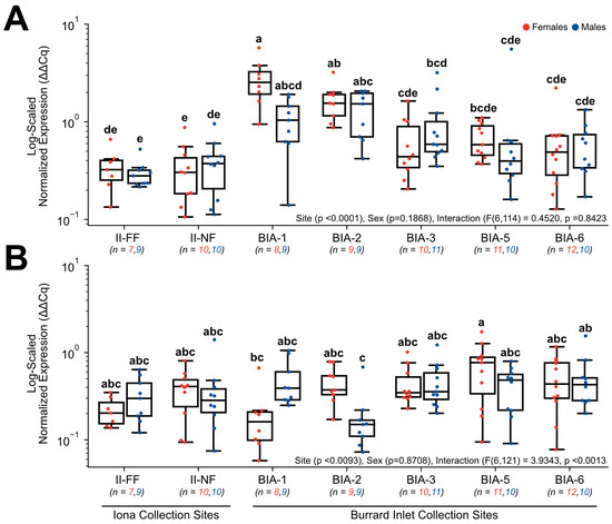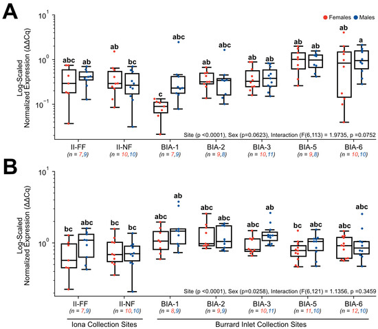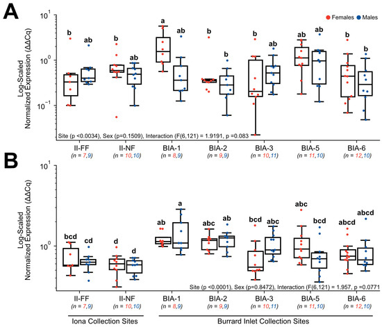 Hepatic gene expression levels of (A) FABP1 and (B) FASN in English sole at near- and far-field sites from the Iona and Lion’s Gate WWTP in Burrard Inlet. Boxplots show median values, 25th and 75th percentiles, minimum and maximum values, and outliers. Two-Way ANOVA with Tukey’s post-hoc analysis was used to determine significant differences between main effects (site and sex) and their interaction. Biological replicates for each site are provided. Significant site effects were observed in both genes; however, there were no significant effects for sex or the interaction in either gene. Different superscript letters indicate significant differences (p < 0.05).