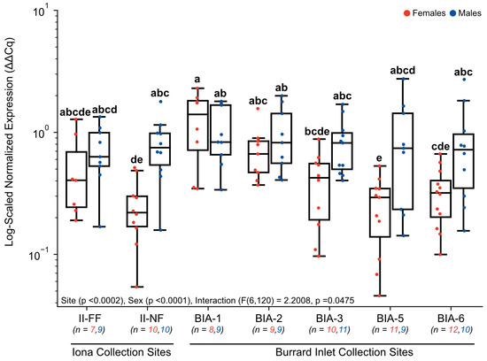 Hepatic gene expression levels of DIO1 in English sole at near- and far-field sites from the Iona and Lion’s Gate WWTP in Burrard Inlet. Boxplots show median values, 25th and 75th percentiles, minimum and maximum values, and outliers. Two-Way ANOVA with Tukey’s post-hoc analysis was used to determine significant differences between main effects (site and sex) and their interaction. Biological replicates for each site are provided. A significant effect of site, sex, and an interactive effect was observed. Different superscript letters indicate significant differences (p < 0.05).