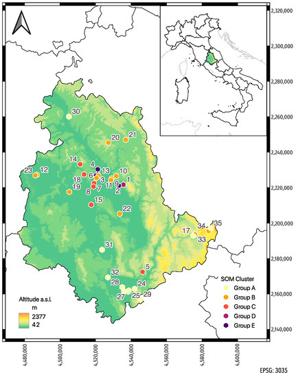 Location of sampling sites. Each apiary is labeled with an identification number from 1 to 35 and colored according to the cluster group to which it belongs in the Self-Organization Map (see Modeling Procedure and Statistical Analysis).