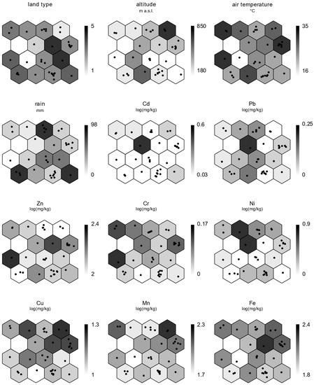 The analysis was carried out in four steps: 1. The bee apiaries were assigned to different nodes using the trained Self-Organizing Map (SOM); 2. For each node on the SOM, the median values of each environmental and metal accumulation variable of the assigned apiaries were calculated. Previously, the metal accumulation levels were log-transformed to normalize their distribution and reduce skewness; 3. The median values obtained in step 2 were represented in a new grayscale map, where the nodes and their corresponding apiaries kept their relative positions according to the trained SOM in steps 1 and 4. Rank correlation and regression analyses were performed between the nodes on the SOM and the median values of the metal and environmental variables. This final step aimed to examine the relationships and associations between the clusters of apiaries and the specific environmental and metal accumulation characteristics.