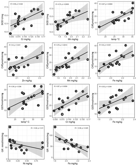 The correlation and regression analyses revealed that SOD, CAT, GST, and GR showed moderate to strong statistically significant relationships with five out of eight metals and one out of four environmental parameters (Figure 4) (Table S1).