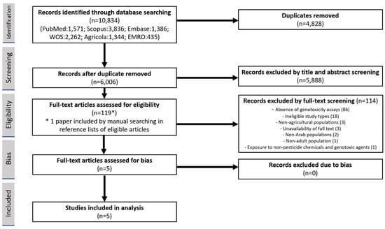 - Sherif, M.; Makame, K.R.; Östlundh, L.; Paulo, S.; Nemmar, A.; Ali, B.R.; Al Rifai, R.; Nagy, K.; Ádám, B. Investigating the genotoxicity of occupational pesticide exposures in Arab countries: Protocol of a systematic review and meta-analysis. medRxiv 2022, 8, 22279322. [Google Scholar]