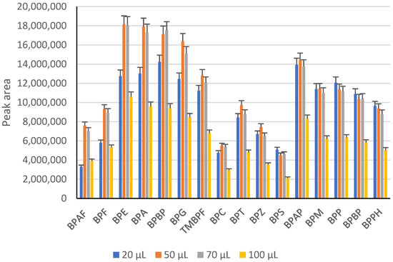 The chromatographic response of bisphenol analogues was determined through derivatization due to their high polarity and non-volatile nature using silylation and performed with N, O-bis(trimethylsilyl)trifluoroacetamide (BSTFA; IUPAC: trimethylsilyl 2,2,2-trifluoro-N-trimethylsilylethanimidate) []. The results of the derivatization tests (Figure 2) showed that the best results are linked to the use of 50 μL of BSTFA/50 μL of acetonitrile and 70 μL of BSTFA/30 μL of acetonitrile. For this reason, 50 μL of BSTFA and 50 μL of acetonitrile were chosen for the derivatization of the samples.