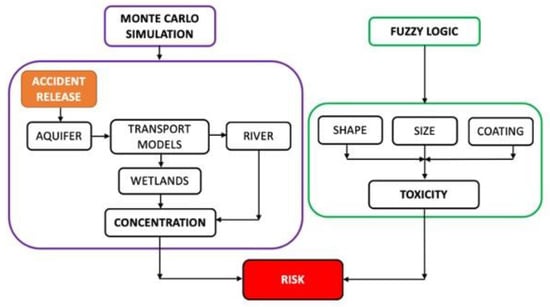 Due to the complexity of the models needed to describe the transport of NPs and the inherent uncertainty associated with some properties used to determine the concentration and risk of NPs, a new approach can be used. This approach consists of integrating two models for risk assessment: Monte Carlo simulation and fuzzy logic. Several Monte Carlo simulations were recently applied to model the concentration of the NPs in wastewater [,] and environmental compartments [], and a fuzzy logic approach developed by our group was used to assess the risk of AgNPs in aquatic ecosystems []. The combination of both models has been tested in the evaluation of the health risks associated with groundwater contamination [,], water contamination [], and air contamination [].