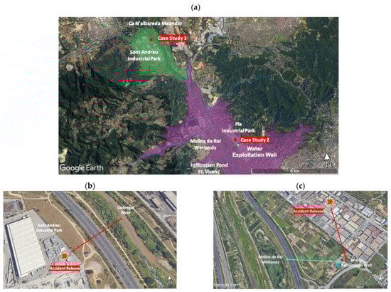 The studied area ranges from the Sant Andreu Industrial Park to the Molins de Rei Wetlands. It is a vulnerable area with a high risk of infiltration and it discharges into the Llobregat River (Figure 3a) [,].