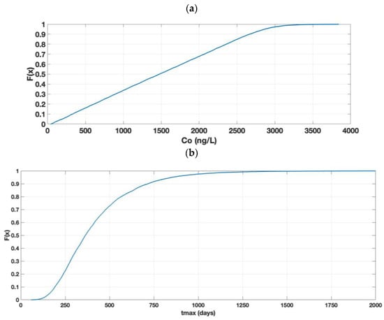 In Equation (1), the concentration presents a Gaussian plane in two dimensions. The maximum concentration (Cmax) in the groundwater occurs on the axes y = 0 and z = 0, and at the time t = tmax when the value of x equals the distance L (the point of discharge into the river or the distance to the well) [].