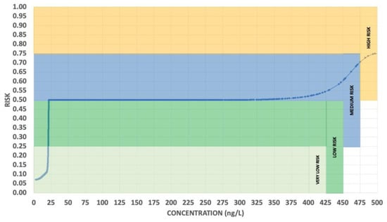 The Monte Carlo approach was used to obtain a set of values for the maximum concentration of AgNPs in aquatic ecosystems, either rivers or wetlands, after their dilution in groundwater. On the other hand, the toxicity value was obtained from the application of the fuzzy model, which used a combination of the AgNPs’ properties (i.e., shape, size, and coating) to obtain this value. Finally, the risk was assessed by combining the concentration and toxicity through the use of the fuzzy model.