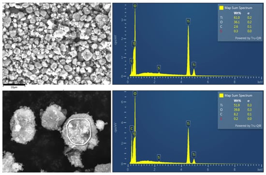 Titanium dioxide nanopowder, with a particle size until 25 nm (Sigma Aldrich Chemical Company St. Louis, MO, USA, Titanium IV Oxide, Anatase nanopowder), was used to conduct the experiments. The titanium dioxide powder was spread on a weighing paper and gently picked up by the sticky carbon surface above the aluminum stubs. An S4700 II cFEG SEM (Hitachi High Technologies-America, Schaumburg, IL, US) with a silicon drift EDX detector (Oxford Instruments, X-MaxN, Abingdon, UK) was used to measure the surface morphology, elemental composition, and distribution of elements. All the SEM data reported were obtained at an acceleration voltage of 10 kV, and the images were collected with a Secondary Electron detector. The elemental mapping and energy spectrums were acquired with Aztec tools (Oxford Instruments, UK). The elemental analysis through the energy dispersive spectrum indicated the presence of Ti, O, C, and S elements (61, 36.1, 2.6, and 0.3 wt%, respectively) (Figure 1).