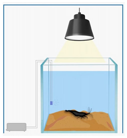 Fifty microcosms (25 for the control and 25 for each treated group) were designed. They consisted of a square aquarium containing 1 L of dechlorinated water; 150 g of synthetic sediment that was previously sterilized with activated carbon and heated in an oven at a temperature of 50–60 °C; an air stone with an air pump; and LED lamps with a 10 h/14 h light/dark photoperiod (controlled by an automatic timer). The water temperature was kept between 19 and 21 °C (Figure 2). These variables reflect the environmental conditions in which Atya lanipes live in the wild.