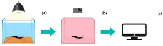 Movement analysis performed on Atya lanipes exposed to different concentrations of TiO2 NPs for 24 h. (a) The microcosm prepared for the bioassay with the Atya lanipes shrimp exposed to the nanoparticles; (b) the acclimatization process of the shrimp in the recording area inside a red plastic box; (c) the analysis of the movement in the videos using Loligo Systems® 5th version software.