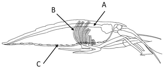 Diagram of Atya lanipes shrimp and the anatomy of the dissected tissues for the oxidative stress assessment. (A) Gut, (B) gills, and (C) nerve cord.