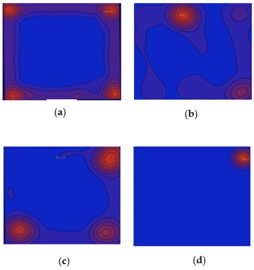 Heat maps for the adult Atya lanipes shrimp behavior in all treatment and control groups. Red areas = more time spent in that area by the shrimp. (a) Control, (b) titanium (100 micrograms/mL), (c) titanium (100 micrograms/mL) ± TiO2 NPs (3 mg/L), (d) TiO2 NPs (3 mg/L).