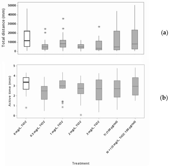 Assessment of movement of adult Atya lanipes shrimp (n = 25 for each treatment). (a) Total distance moved (mm) and (b) active time (min) of Atya lanipes shrimp after 24 h acute exposure to different TiO2 NP suspension concentrations, titanium (100 mg/L), and TiO2 NPs + titanium (3 mg/L; 100 mg/L). * = outliers.