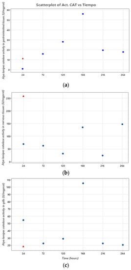Atya lanipes catalase activity in tissues after 24 to 264 h of exposure to 10 mg/L of TiO2 NPs. The red triangle is the catalase activity in the control group. (a) Gastrointestinal tissues, (b) nervous tissues, and (c) gill tissues.