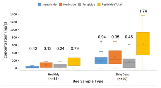 - Ostiguy, N.; Drummond, F.A.; Aronstein, K.; Eitzer, B.; Ellis, J.D.; Spivak, M.; Sheppard, W.S. Honey bee exposure to pesticides: A four-year nationwide study. Insects 2019, 10, 13. [Google Scholar] [CrossRef] [PubMed]