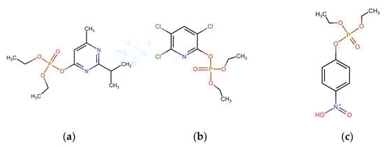 The 2D structures of the oxon metabolites of the OP pesticides diazinon (DZ), CP, and parathion were retrieved from the PubChem database (https://pubchem.ncbi.nlm.nih.gov) accessed on 28 February 2023. We chose the oxon metabolites over of the original compounds due to their direct association with NDT [,]. The images of the chemical structures of the organophosphates were generated using Marvin JS [] and are shown in Figure 1.