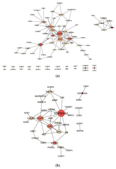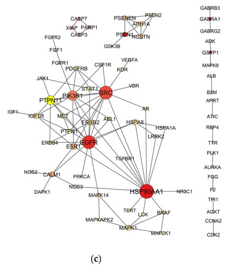 The analysis of PPI networks revealed 81 nodes and 113 edges for the DZO-NDT network, 37 nodes and 50 edges for the CPO-NDT network, and 71 nodes and 103 edges for the PO-NDT network (Figure 2). The top 10 hub nodes for each network were identified using the MCC algorithm in the cytoHubba plugin of Cytoscape. Topological measurements were obtained using the Network Analyzer tool. HSP90AA1, SRC, MET, and EGFR were hub nodes that were common among the three OPs. All hub nodes are listed in Table 2, along with their topological measurements. The measurements for the entire network are available in the supplementary materials (Tables S1–S3).